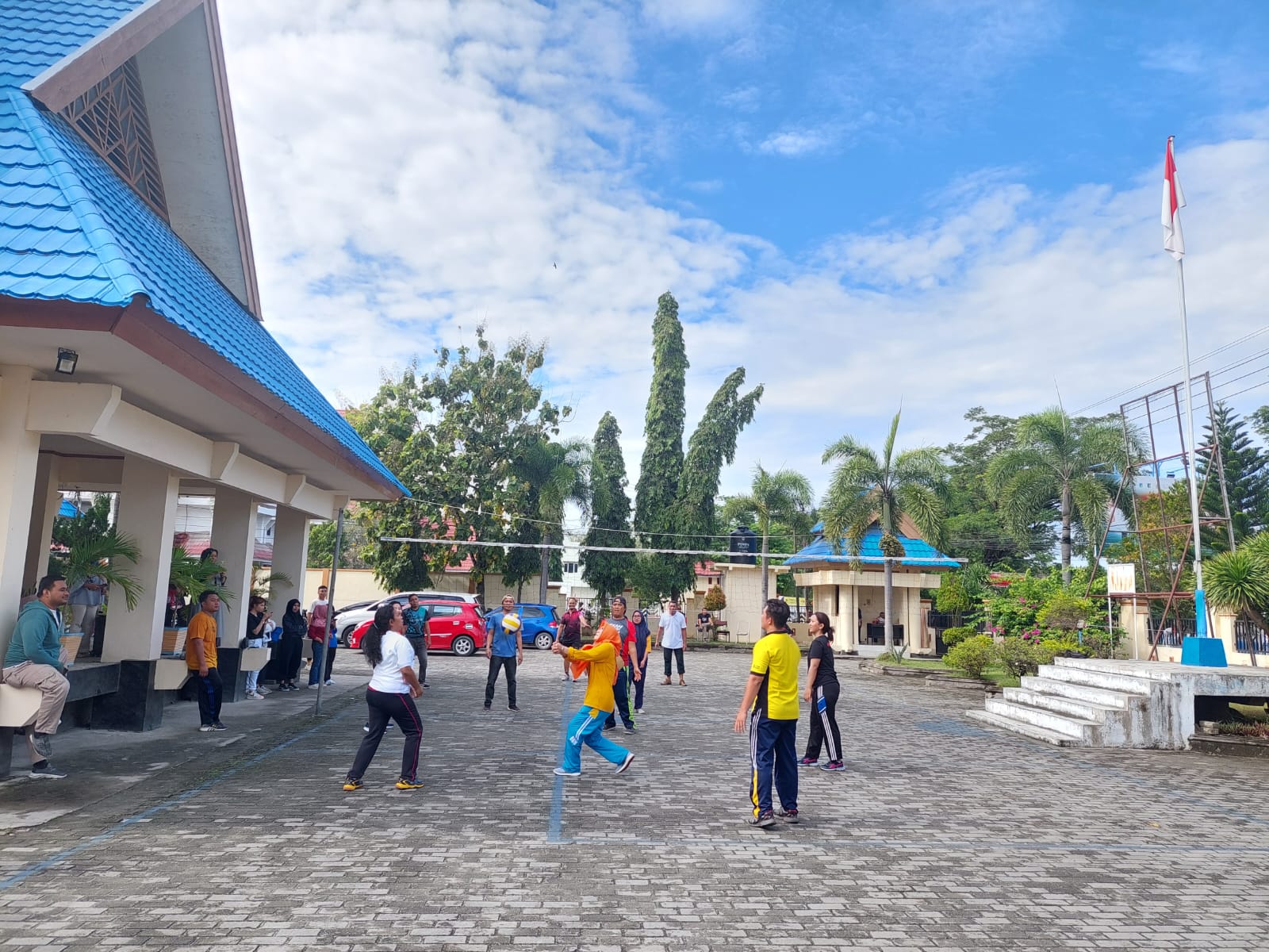 Palu, Sulawesi Tengah. Dinas Pariwisata Provinsi Sulawesi Tengah melaksanakan kegiatan olahraga rutin bola voli setiap hari jumat bersama Badan Narkotita Nasional (BNN) Provinsi Sulawesi Tengah dan SMP Negeri 6 Palu dihalaman kantor Dinas Pariwisata Provinsi Sulawesi Tengah. Jumat (05/08/2022)