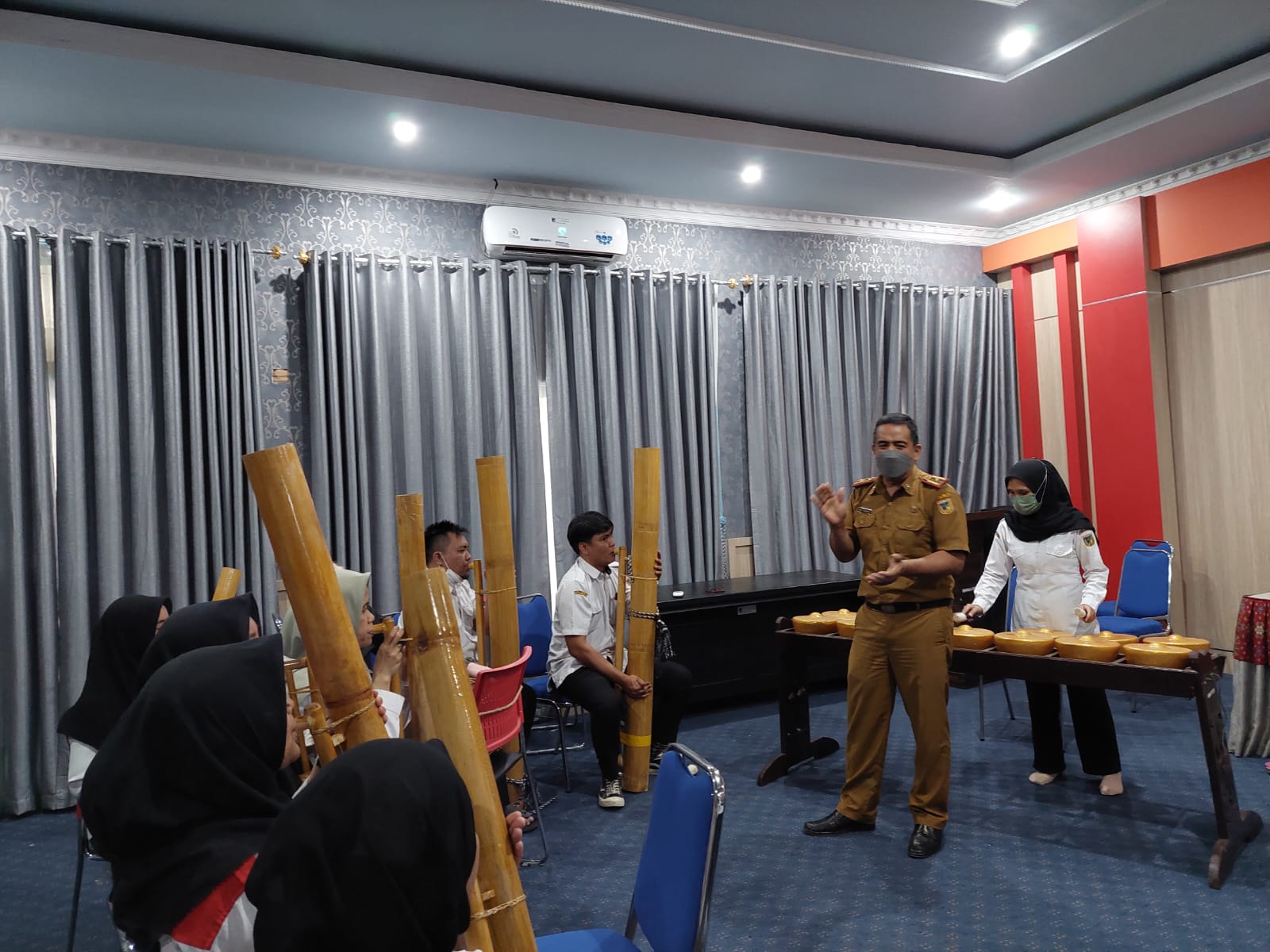 Palu, Sulawesi Tengah. Anggota Tim Kolaborasi Musik Etnik Bambu dan Kakula oleh Sanggar Seni Pesona Sulawesi Tengah melaksanakan latihan rutin yang dilaksanakan diruang rapat Polindo Dinas Pariwisata Provinsi Sulawesi Tengah. (05/08/2022)