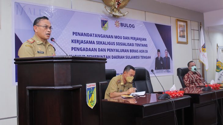 Palu, Sulawesi Tengah. Gubernur Sulawesi diwakili Asisten II Bidang Perekonomian dan Pembangunan Dr. Rudi Dewanto SE MM, mengadiri Penandatanganan MOU dan Perjanjian Kerja sama sekaligus Sosialisasi tentang Pengadaan dan Penyaluran Beras ASN di Lingkup Pemerintah Daerah Sulawesi Tengah. Bertempat diruang Polibu Kantor Gubernur. Selasa, (12/4/2022)