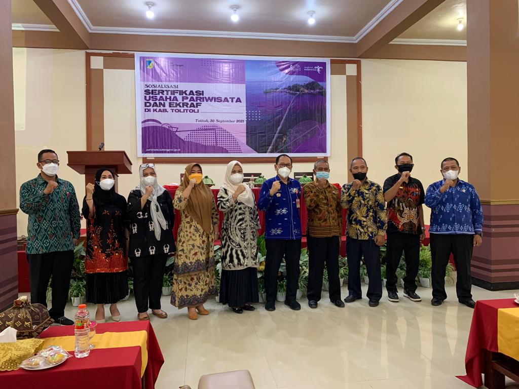 Staf Ahli Ibu Ellyah HP. Sagala, SP mewakili Bupati Tolitoli berkenan membacakan sambutan Gubernur Sulawesi Tengah sekaligus membuka secara resmi kegiatan Sosialisasi Sertifikasi Usaha Pariwisata dan Ekonomi Kreatif yang dilaksanakan oleh Dinas Pariwisata Provinsi Sulawesi Tengah di Hotel Mitra Utama Kab. Tolitoli yang dihadiri oleh Kepala Dinas Pariwisata Provinsi Sulawesi Tengah, Kepala Dinas Pariwisata Kabupaten Tolitoli serta beberapa OPD terkait. Kegiatan ini diikuti oleh Utusan Perwakilan Peserta pelaku usaha perhotelan, rumah makan dan kafe berjumlah 30 Orang.