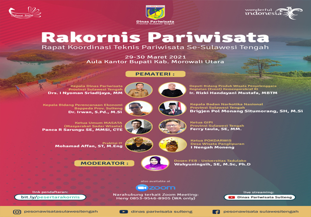 Dinas Pariwisata Provinsi Sulawesi Tengah akan melaksanakan Rakornis Pariwisata tahun 2021 di Kabupaten Morowali Utara pada tanggal 29 s.d 31 Maret 2021 yang dilaksanakan secara hybrid, menghadirkan Dinas Pariwisata Kab/Kota Se-Sulawesi Tengah yang didahului dengan malam ramah tamah bersama Bapak Wakil Gubernur Sulawesi Tengah dan Plh. Bupati Morowali Utara beserta para Kepala OPD lingkup Provinsi dan Kab. Morowali Utara pada tanggal 28 Maret 2021 di Aula Kantor Bupati Morowali Utara.