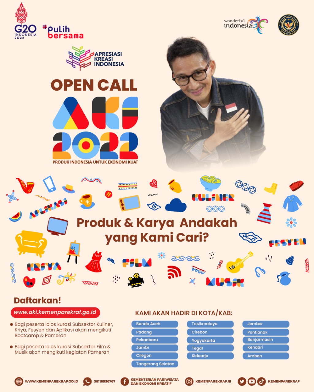 Anda pelaku ekonomi kreatif di bidang Kuliner, Kriya, Fesyen, Aplikasi, Film, dan Musik waktunya menjadi bagian dari AKI 2022, dengan mendaftar di :