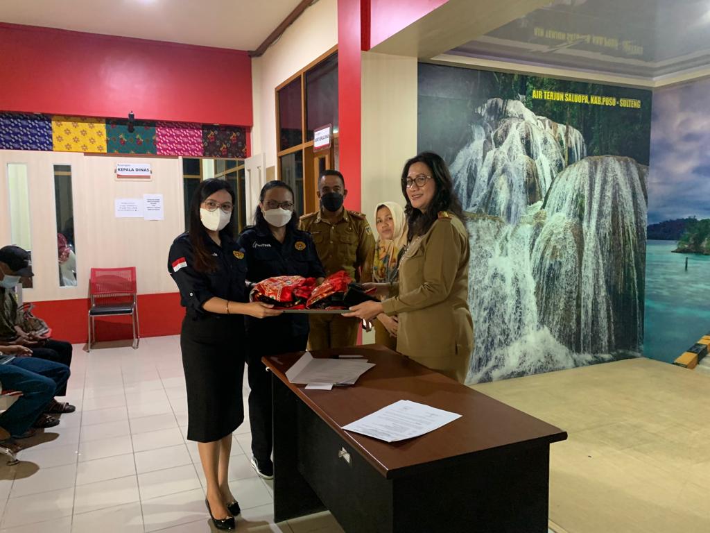 Kepala Dinas Pariwisata Provinsi Sulawesi Tengah Dra. Diah Agustuningsih, M.Pd yang didampingi oleh Kepala Seksi Mitra Usaha Pariwisata Satrisni Bisno, SE dan Kepala Seksi Standar Usaha Dan Sertifikasi Usaha Pariwisata Max William Baginda, M.Si melakukan penyerahan baju adat kepada Sanggar Katundana SMK GKST 1 Tentena yang diterima oleh Riska Alfana Petingko dan Sanggar Lentora Sintuwu yang diterima oleh Yordan Ito.
